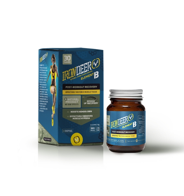 Спортивная добавка IRONDEER ELEMENT B сокращает время восстановления организма после серьезных нагрузок, помогает справиться с крепатурой в мышцах, повышает гемоглобин и борется с гипоксией.